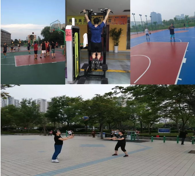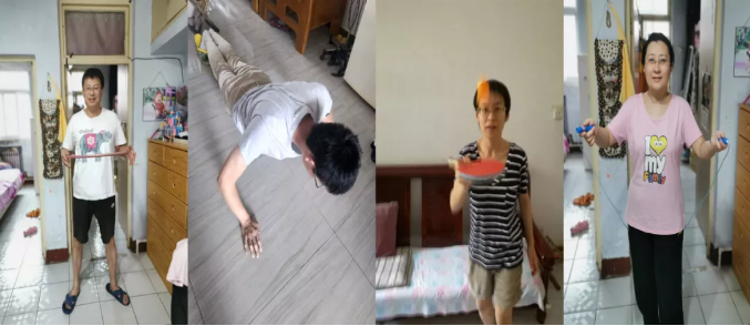 活动开展以来,学院全体教职工参与此次抗疫健身活动,62人上交各类作品一百余件。体育锻炼方面,多以单人健身活动为主:有的老师在清晨或者夜间人员数量较少的情况下,利用社区、公园、运动中心的公共体育器材开展锻炼(图1);有的老师则充分利用学院工会给各工会小组配置的握力器、呼啦圈、跳绳和毽球等体育器械开展健身活动(图2);有的老师居家也开展了丰富多彩的体育锻炼(图3);还有一部分老师则以慢跑、快走、登山等运动为主(图4);有的老师还在篮球场、健身房等地“挥汗如雨”,强身健体。