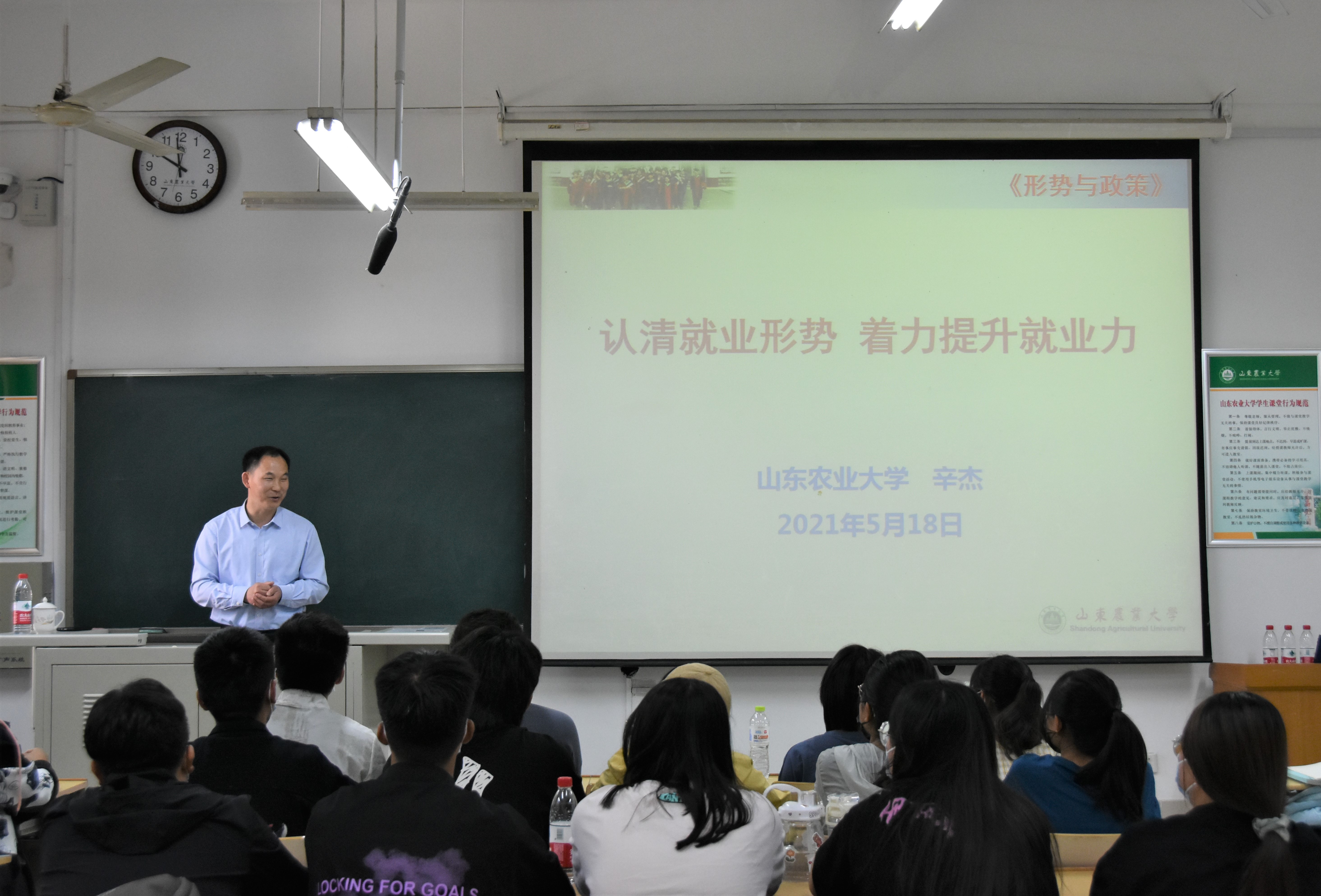 课堂上,辛杰从我国就业制度的历史沿革、当前就业形势、影响就业原因分析、促进就业的政策、着力提升就业力等五个方面,深刻剖析了当前的就业形势特点、影响就业形势的原因以及促进就业的国家政策导向。他引用党的十九大报告中的“就业是最大的民生。要坚持就业优先战略和积极就业政策,实现更高质量和更充分就业。”着重强调了当前就业市场面临就业失衡矛盾、人才观念改变、毕业生“族化”生存现象等突出问题,面对较大的就业压力,党中央、国务院高度重视就业工作,出台了一系列稳就业、促就业的政策措施,有效地确保了就业形势的基本稳定,就业市场依旧蕴含着巨大潜力。随后,辛杰针对如何提升就业竞争力为同学们提出了具体建议,他勉励青年学生要加快就业择业思维、理念转变、加强职业生涯规划、提高就业创业能力,才能克服就业难题,实现人生价值。