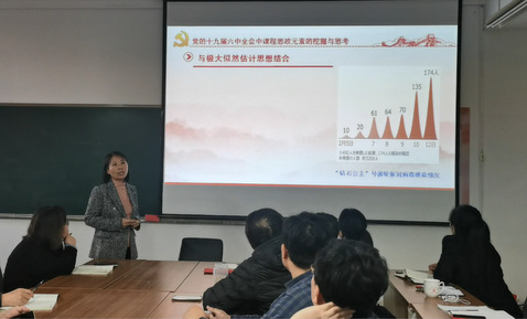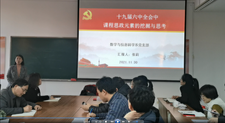 为进一步深入贯彻学习党的十九届六中全会精神,总结巩固学院关于“青年教师课程思政能力提升培训班”的学习成果,数学系党支部于2021年11月30日举行以“聚焦十九届六中全会,挖掘课程思政元素”为主题的主题党日活动。公共数学系优秀青年教师张莉将自己在培训班学习心得体会与十九届六中全会公报有机结合,为全体教师做了一场题为“党的十九届六中全会中课程思政元素的挖掘与思考课程思政”的报告。