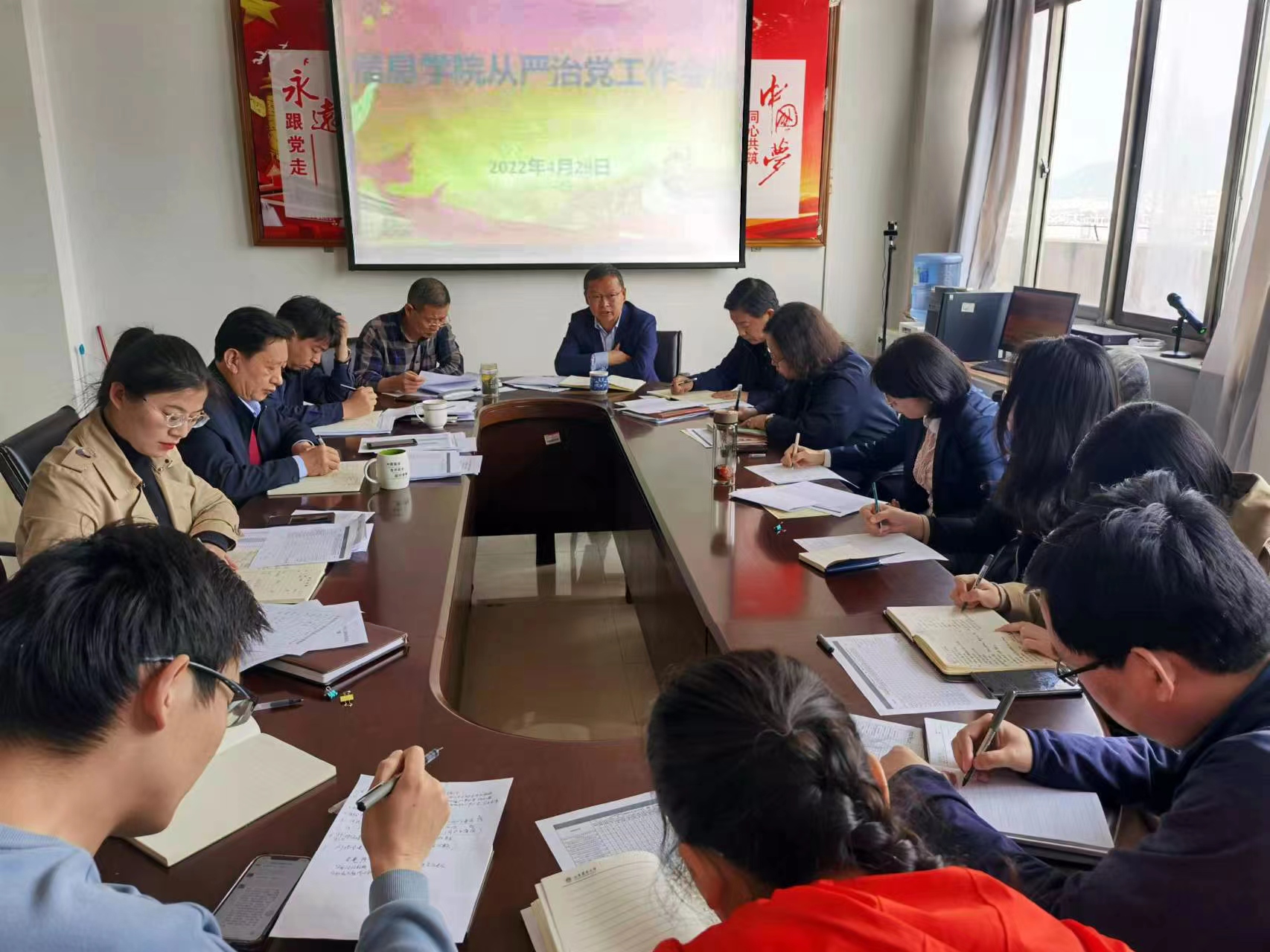 会议指出,2022年是我国踏上全面建设社会主义现代化国家新征程,向第二个百年奋斗目标进军的重要一年,党的二十大将胜利召开,这是党和国家政治生活中的一件大事。学院全面从严治党工作要坚持四个聚焦,一是聚焦强化政治引领,加强理论学习。要坚持的主基调,发挥全面从严治党的政治引领和政治保障作用,严格落实第一议题制度,充分利用支部政治理论学习、学习强国等平台抓实党员干部理论学习,全面提升党员干部的政治判断力、领悟力、执行力;二是要聚焦夯实党建基础,加强支部规范化建设。对标支部评星定级的具体要求,严格落实三会一课制度,开展形式多样的主题党日活动,制定支部发展路线图,确保支部活动规范、有序开展,实施支部精品工程,不断提升支部的战斗力、凝聚力和创造力;三是聚焦守好安全底线,确保学院和谐稳定。要充分发挥五级网格信息员作用,毫不松懈抓好意识形态工作、安全生产工作、常态化疫情防控工作,营造平安和谐稳定的校园环境;四是聚焦加强纪律建设,营造风清气正的良好氛围。对照学校作风建设专项行动要求,落实严真细实快作风要求,以更加优良的工作作风担当作为,以更加昂扬的精神状态狠抓落实。
