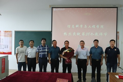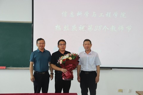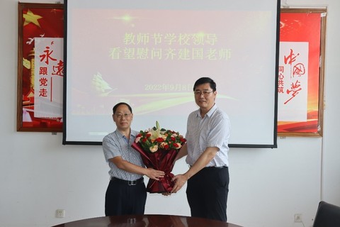 王勇副校长向齐建国老师送上鲜花并致以节日的问候,他指出,齐建国老师36年来勤勤恳恳教书育人,教育教学成绩显著,桃李满天下,令人尊重;他强调,以齐建国老师为代表的学院教职工为学校和学院各项事业发展做出了贡献,向学院所有辛勤耕耘在教育战线的老师们致以节日的问候和美好的祝福。他关切的询问了齐老师教学、科研、生活等情况,祝福齐老师工作顺利,阖家幸福;齐建国讲述了自己36年的从教经历及从事教育工作以来的感悟和体会,他感谢校领导的关怀和厚爱,表示一定将学校的关心、关爱传达给每一位老师。