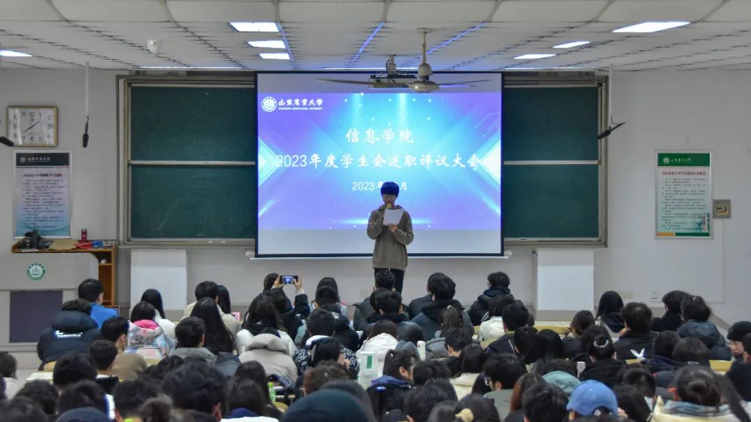 12月15日,信息学院学生会2023年度述职评议大会在泮河校区综合楼N104顺利举行。学院团委老师、学生会各部门负责人、志愿者以及班级学生代表参加。