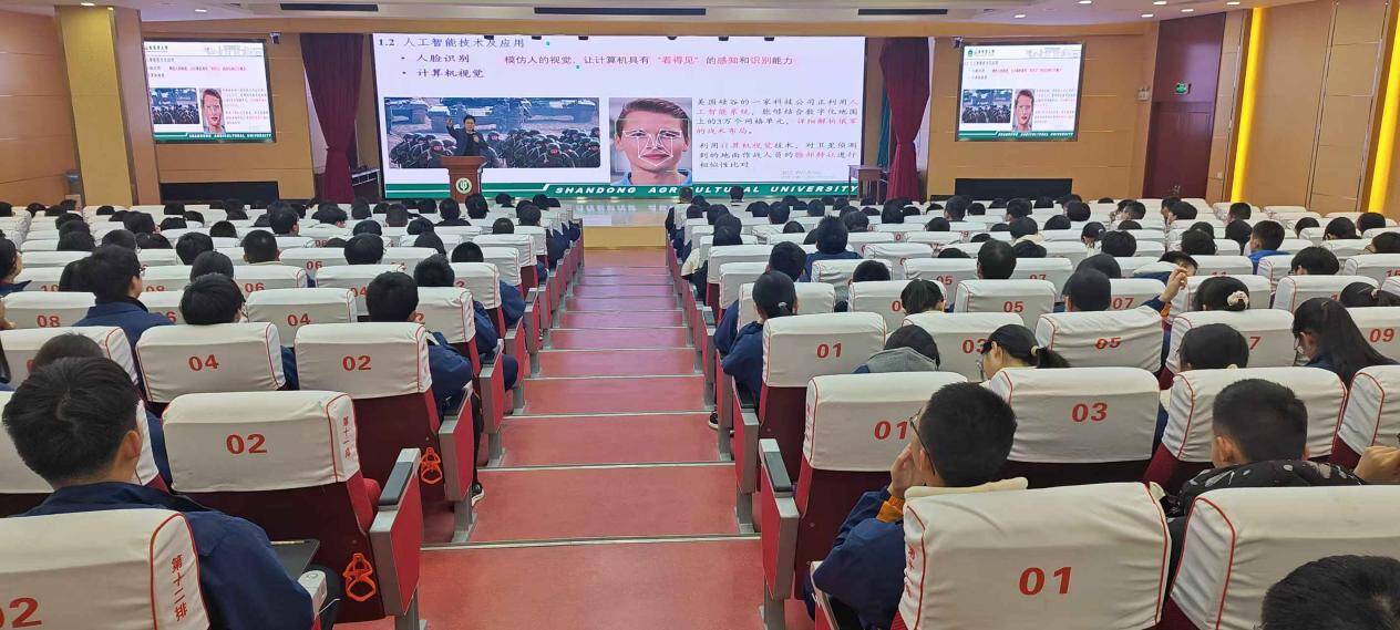 面向英雄山中学教师代表和高二300余名学生,孙博老师重点宣讲了人工智能的基本概念、代表性技术及应用领域。并通过人机对话机器人、微信语音转文字、校园刷脸入校门禁系统等生动的案例分析,让学生们更直观地了解了AI在生活中的应用。同时,孙博还从人类学习的层次和在实例中学习这一机理的视角,对机器学习及人工神经网络进行了具体介绍,让学生们对人工智能这一前沿科技有了更深入的了解,对人工智能的发展充满期待。最后,他还展示了山东农业大学高科技、智能设备,详细解读专业学科设置、人才培养方案及就业前景,并对针对老师及同学们提出的问题进行解答。