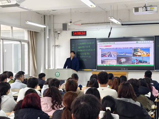 林海来到泮河校区教学楼,走进康林老师的测绘专业核心课《测绘学概论》课堂上,与2024级测绘、遥感专业的同学同上一门课。课堂上,丛康林老师结合南海岛礁、珠峰测绘等典型案例深入浅出的讲解了测绘学的基本概念和科学内涵,阐释了测绘工作者的使命担当。林海认真听取授课教师讲解,并仔细观察着同学们的听课情况。