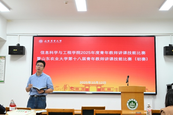 10月12日,信息学院2025年度青年教师讲课技能比赛暨山东农业大学第十八届青年教师讲课技能比赛在文理楼804举行。比赛旨在进一步加强青年教师队伍建设,引导青年教师深化课堂教学改革、优化教学模式、不断提高教学水平。学院本科教学督导组成员、各系教学主任、获奖教师代表担任评委。教学副院长兰鹏到现场指导,教学督导组主任王成义主持比赛。