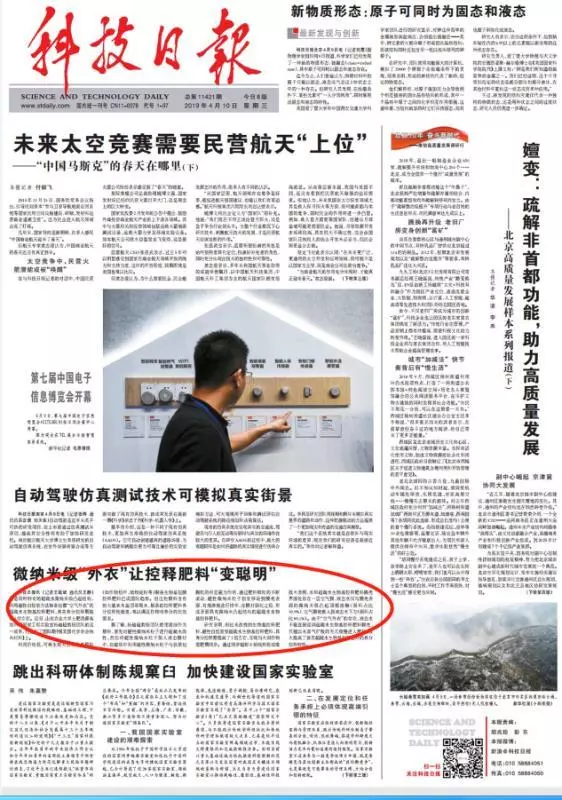 4月10日,科技日报在头版以《微纳米级“外衣”让控释肥料“变聪明”》为题,详细报道了我实验室杨越超教授团队最新科技进展。