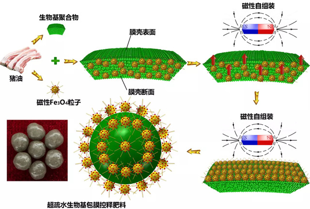 据了解,杨越超教授团队使用猪油作为原料,首先对磁性微纳米粒子进行超疏水改性,然后将磁性微纳米粒子加入液态膜材中,在磁场中利用磁性微纳米粒子与铁质包膜机的相互磁力作用,通过肥料颗粒的不断滚动,磁性微纳米粒子自发移动到膜壳表面,有规律地进行排布,在膜材固化之后,形成表面具有微纳米凸起结构的超疏水生物基控释肥料。
