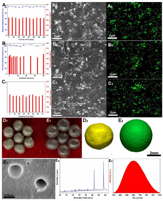 研究表明,相比未改性的生物基控释肥料,磁性自组装型超疏水生物基控释肥料,其养分控释期提高了1倍左右,实现与大田作物需肥期同步。通过同步辐射X射线相称成像技术表明,水和超疏水生物基控释肥料膜壳界面处存在一层空气膜,液态水仅与膜壳表面的微纳米级凸起顶部接触(面积占比10.9%),空气膜被嵌入到液态水下方(面积占比89.1%)。由于“空气外衣”的存在,液态水不能直接浸润超疏水生物基控释肥料膜壳,只能以水蒸气扩散的方式缓慢进入肥料,极大提高了该类超疏水生物基控释肥料的养分控释特性。