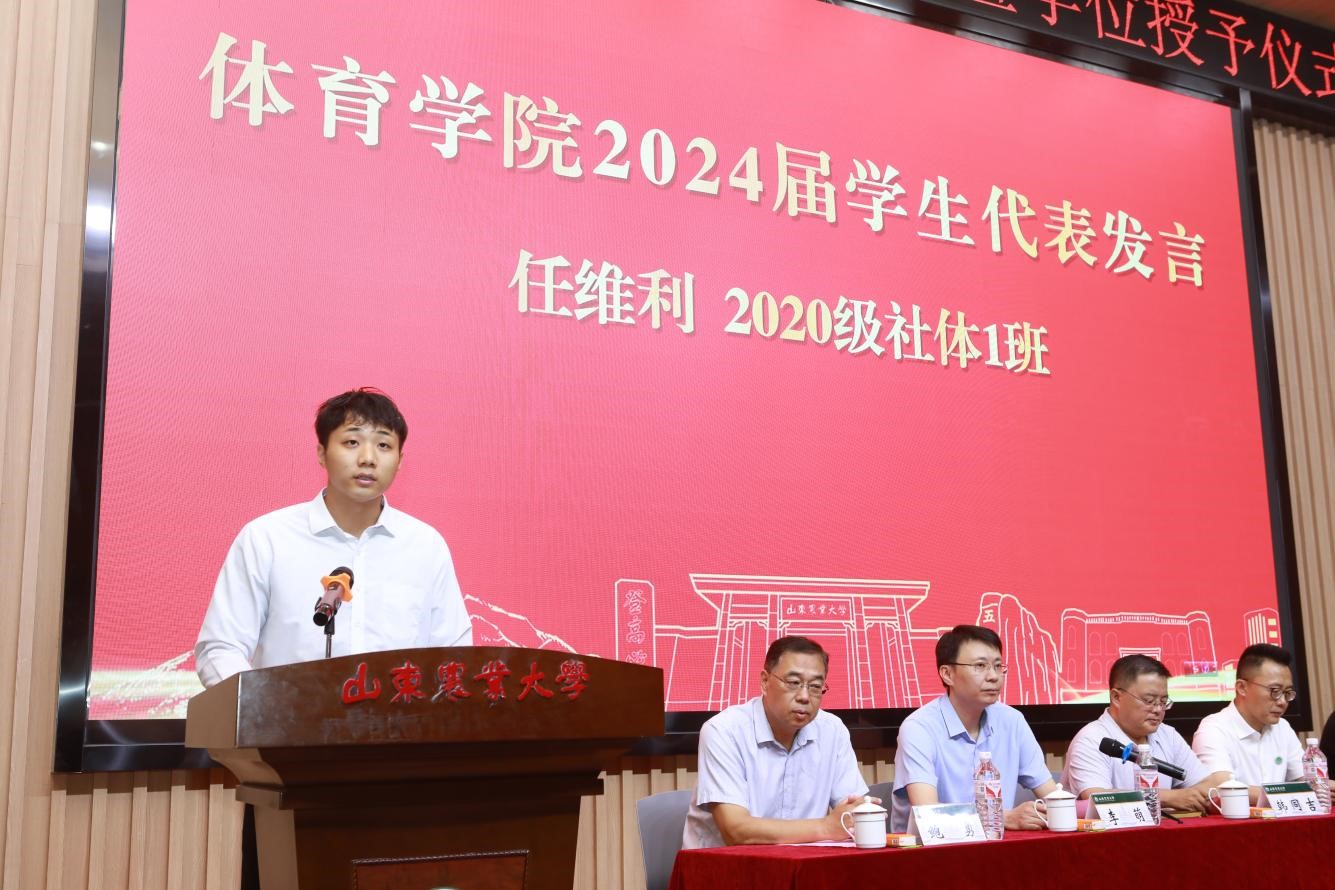 2020级社体1班任维利代表全体毕业生发言,表达了对老师和同学们的感谢祝福,以及对母校深深眷恋,并代表全体毕业生承诺一定不会辜负老师们殷切期望和深情嘱托,秉承登高必自的校训,把山农人的精神播撒到更广袤的土地。