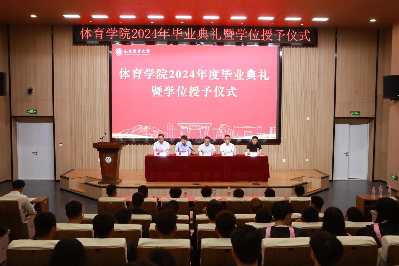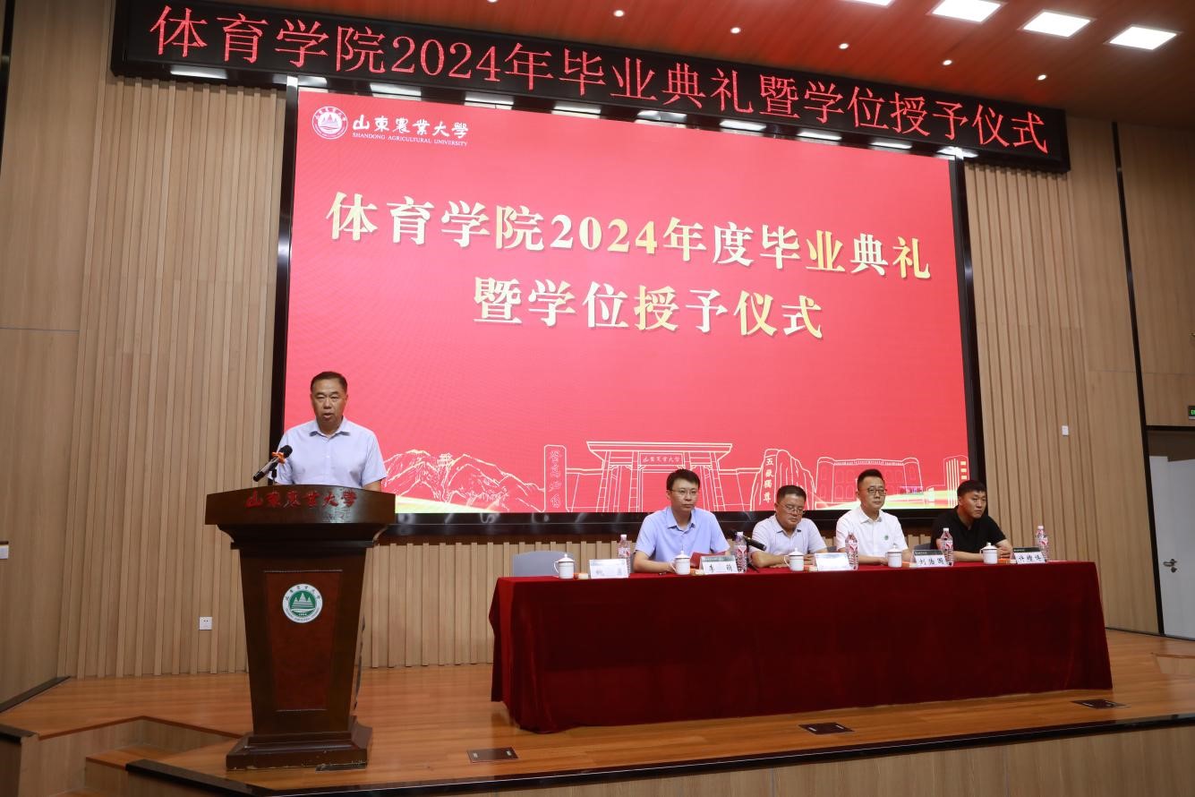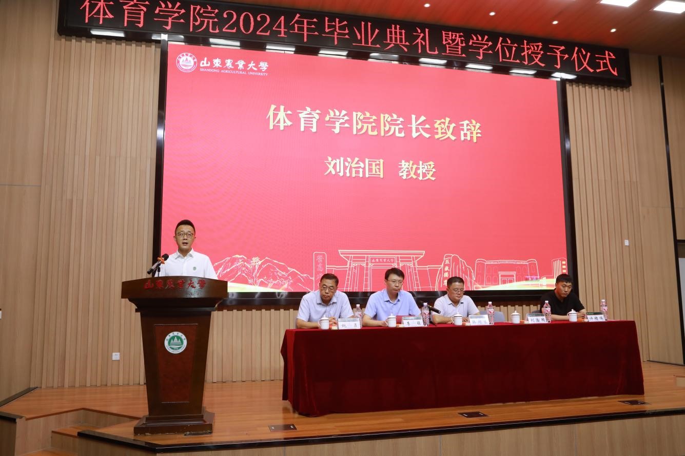 院长刘治国发表致辞,向顺利完成学业的毕业生们表示热烈祝贺,并满怀深情地回顾了2024届毕业生四年大学时光的成长之路。他对毕业生提出四点希望,一是希望毕业生们胸怀理想,志存高远,既有请党放心强国有我的爱国之情,又有勇立潮头、敢为人先的强国之志;二是希望毕业生们能够永远保持一颗谦逊心,始终保持对知识的渴望和对未来的向往,牢记自己曾经是一名体育人,永远保有体育人良好的锻炼习惯、顽强拼搏的意志品质、乐观向上的生活态度、质朴善良的价值追求;三是希望毕业生们敢于直面挫折和挑战,趁着年轻,多学、多做、多试、多闯;四是希望你们能够始终怀有一颗感恩的心,感恩那些曾经支持和帮助过你们的老师、家人和朋友们,牢记山东农业大学是毕业生们的家,老师们永远欢迎远方的游子回家。