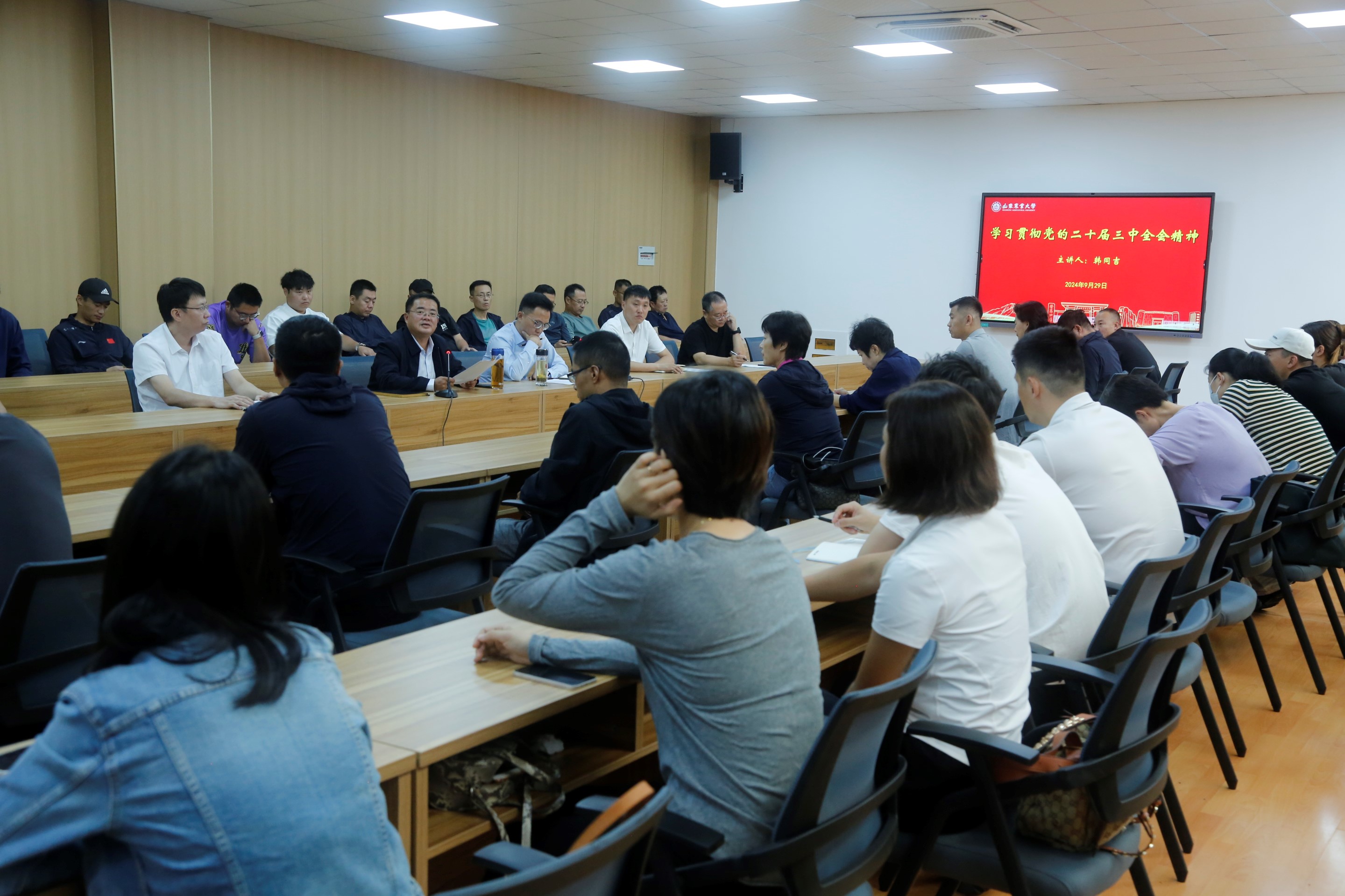 学院党委书记韩同吉带领全体教师进行了党的二十届三中全会精神专题学习,传达了徐书记和冷校长在学校处级干部暑期综合能力提升培训班上讲话精神,要求全院师生把学习宣传贯彻党的二十届三中全会精神作为当前和今后一个时期的重大政治任务,在全面领会、学深悟透上下功夫,内化于心、外化于行,把学习成效创造性地融入到教育管理工作和履职过程中,为一流农业大学建设贡献体育力量。他简要总结了学院2024年上半年工作,重点介绍了学院人才引进、暑期“农小苗培训”、场馆设施改造、教学条件改善、社会服务相关情况。他还从三个典型案例入手,开展了意识形态安全和师德师风警示教育,希望老师们要充分认识加强意识形态工作的重要性,不断提高对自身的要求,营造学院良好的师德师风建设氛围。