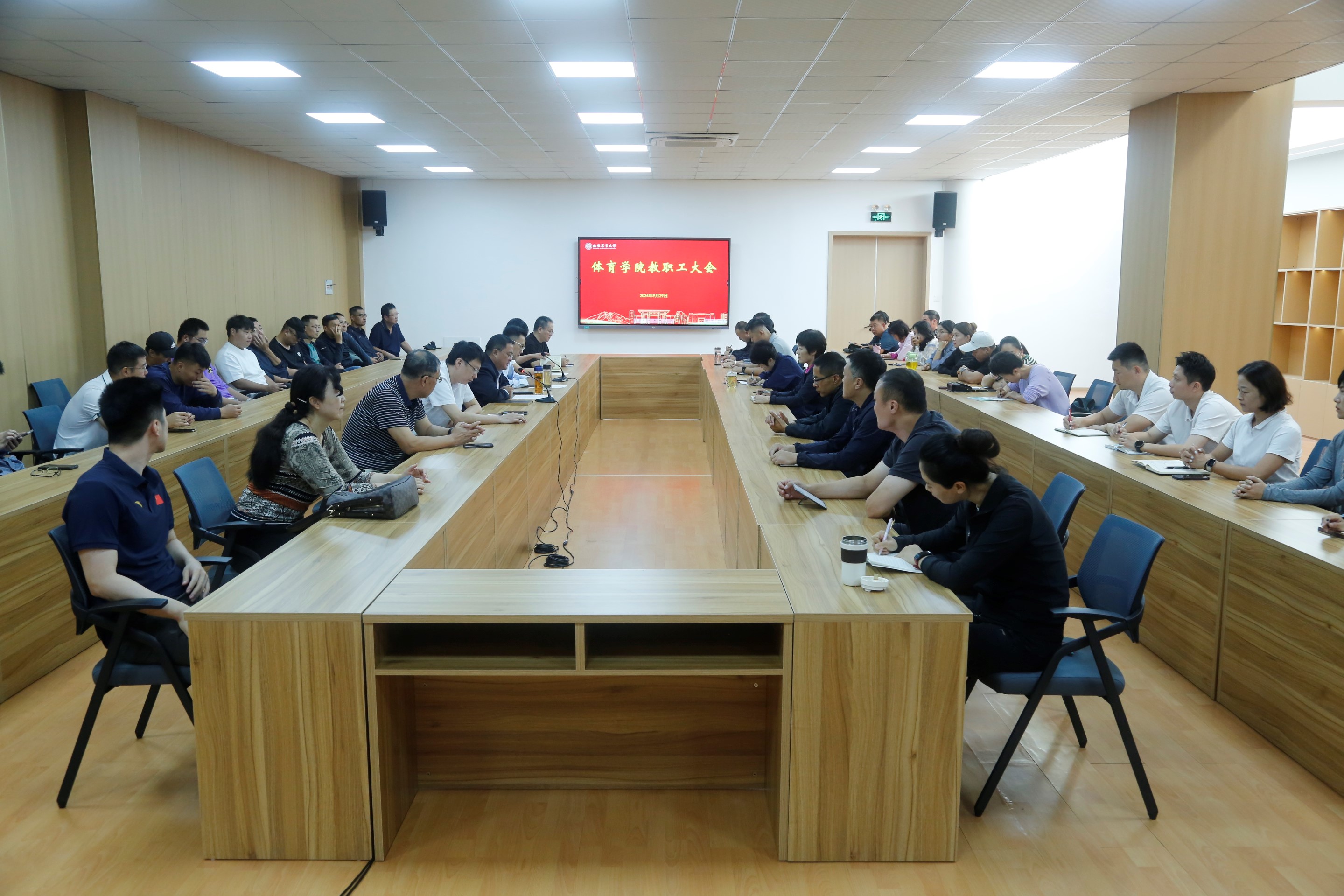新引进的国际级健将、两次获得武术散打90公斤级世界冠军的卞庆各老师,羽毛球国家级健将苏全鑫老师,学校党委选派的思政辅导员吴丹老师与大家见面,全院教职工参加了会议。