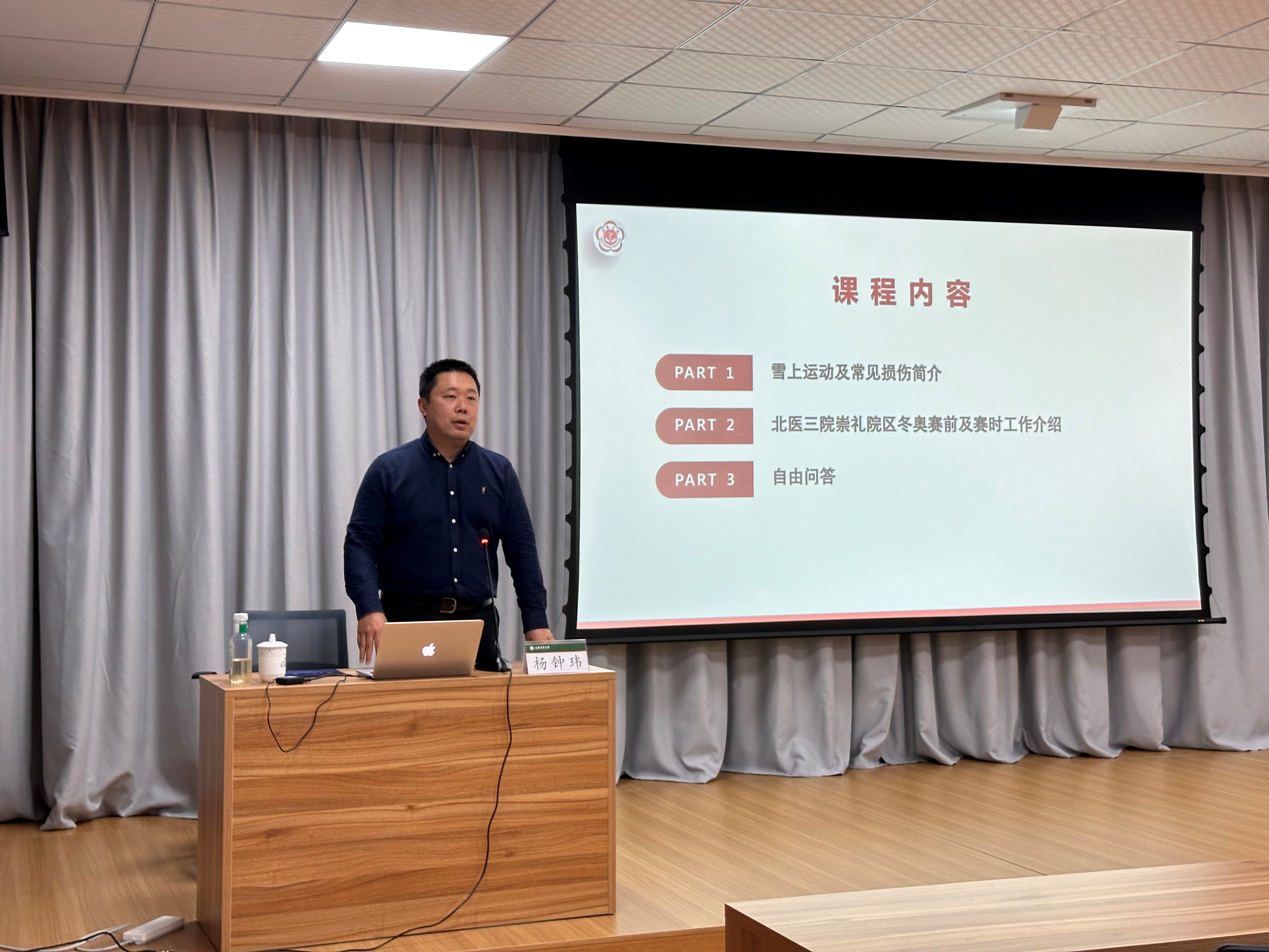 杨钟玮教授以《北京冬奥会雪上运动损伤救治——经验与总结》为题,详细介绍了雪上运动和常见运动损伤情况,结合自身参与的多个北京冬奥会过程中成功处置的运动损伤救治案例,深入剖析了当前运动损伤救治领域的最新研究成果和行业发展趋势,分享了北医三院崇礼院区冬奥赛前及赛时相关工作情况,并与师生现场进行了亲切热烈的交流,耐心为师生答疑解惑。