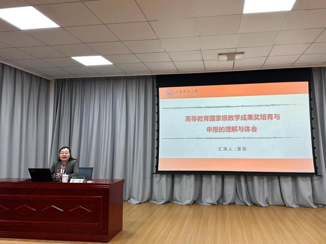 12月10日,山东师范大学二级教授、博士生导师、山东省乡村振兴体育研究院院长曹莉教授走进体育科学大讲堂,为学院教师作题为《高等教育国家级教学成果奖培育与申报的理解与体会》的报告。院长刘治国主持报告会,学院全体教师参加。