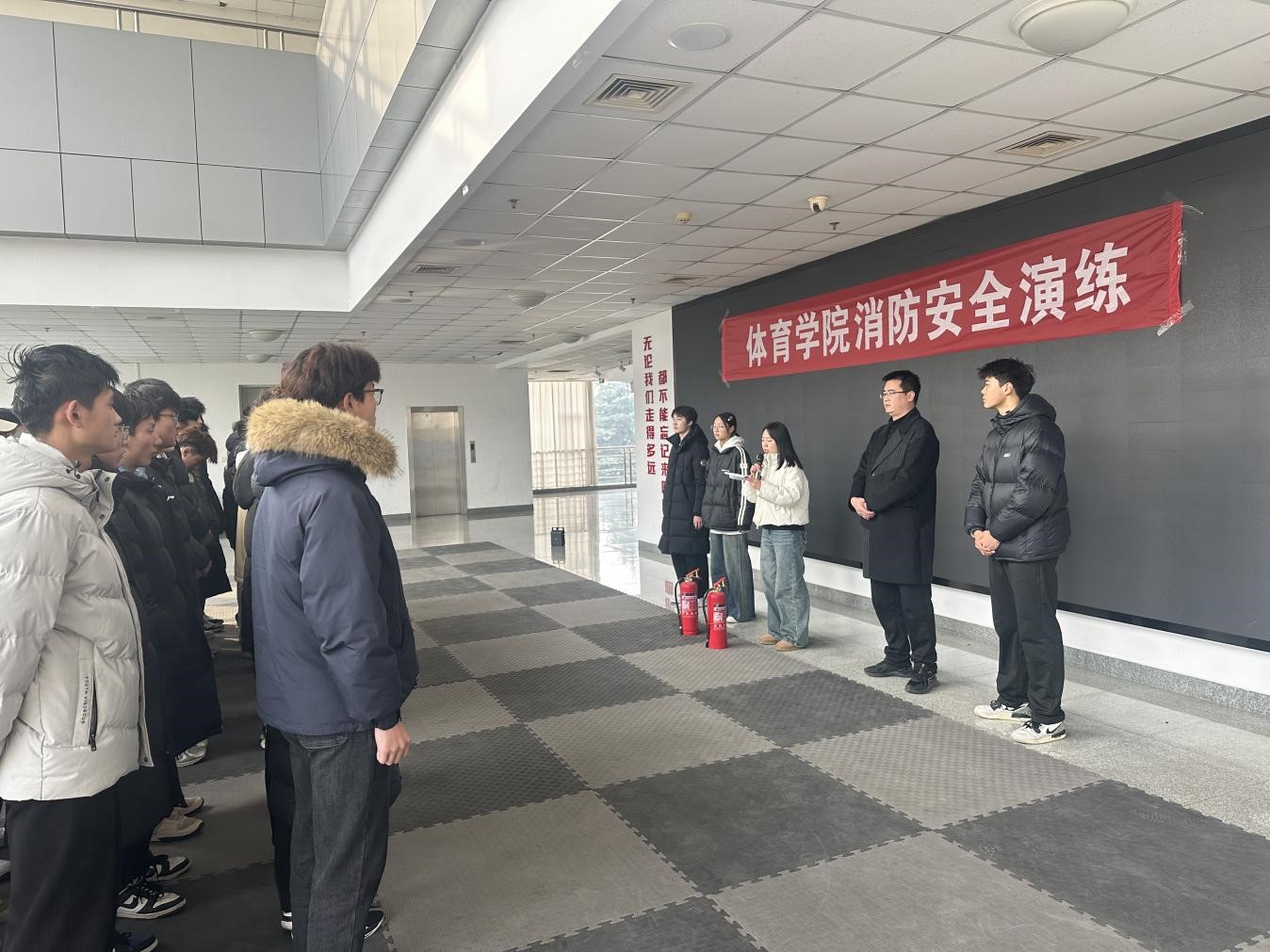 随着一阵急促的警报声响起,消防安全演练正式拉开帷幕。假设教学楼某教室突发“火情”。各班级学生在团委老师的组织下,迅速用湿毛巾捂住口鼻,弯腰低姿,按照预定的疏散路线,紧张有序地从体育馆各个楼层疏散至楼外安全区域。整个疏散过程用时3分钟,全体学生均安全撤离。集合后,吴老师对本次演练进行了点评和总结,指出了演练过程中存在的不足之处,并提出了改进建议。
