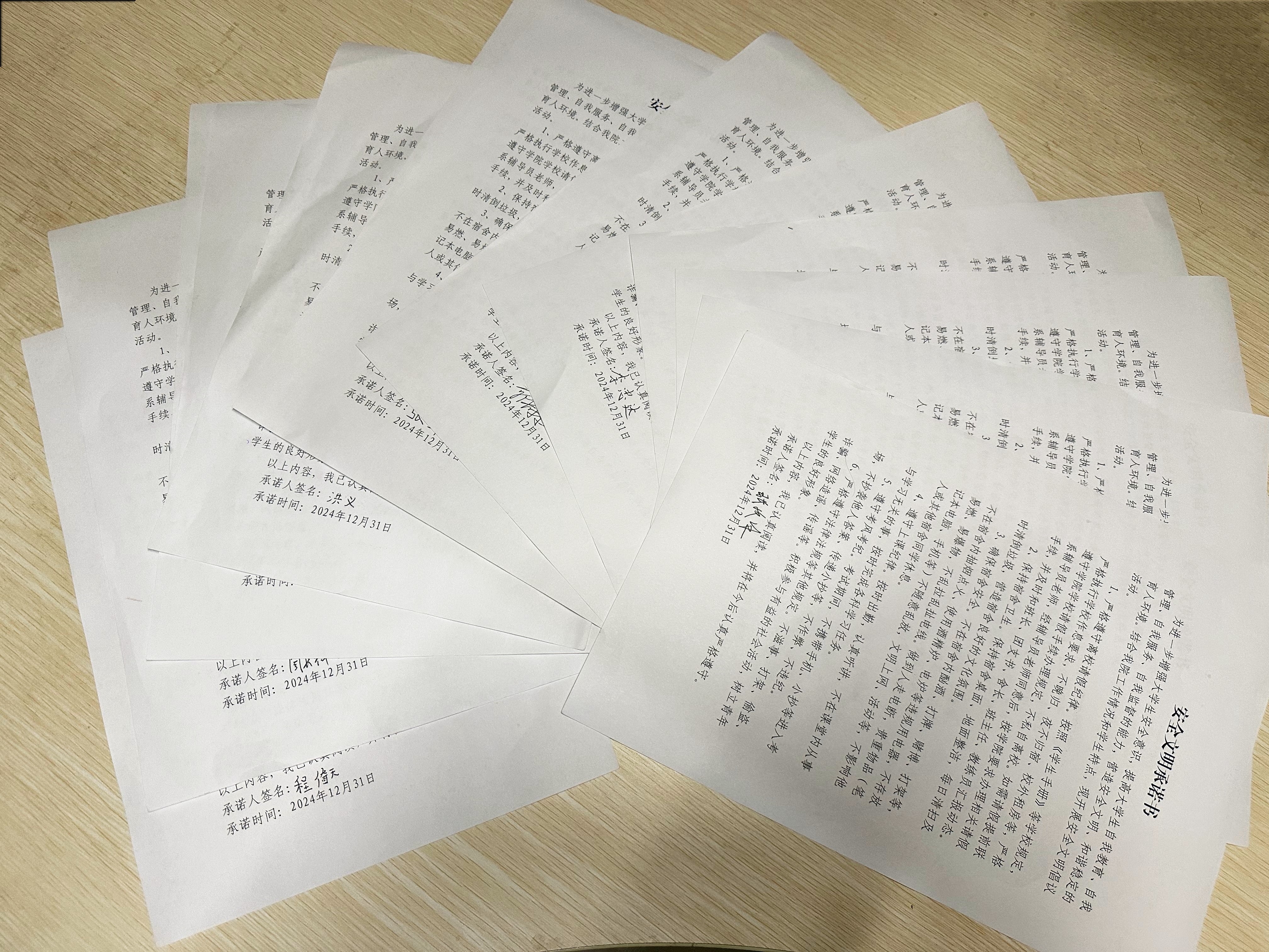 除主题班会外,学院组织学生签署考试诚信承诺书,利用年级、班级工作群等多种宣传渠道,以简洁明了的文字和形象生动的图片,提醒同学们诚信为本,自觉遵守考试纪律,传递诚信考试的正能量,营造诚信应考的浓厚氛围。